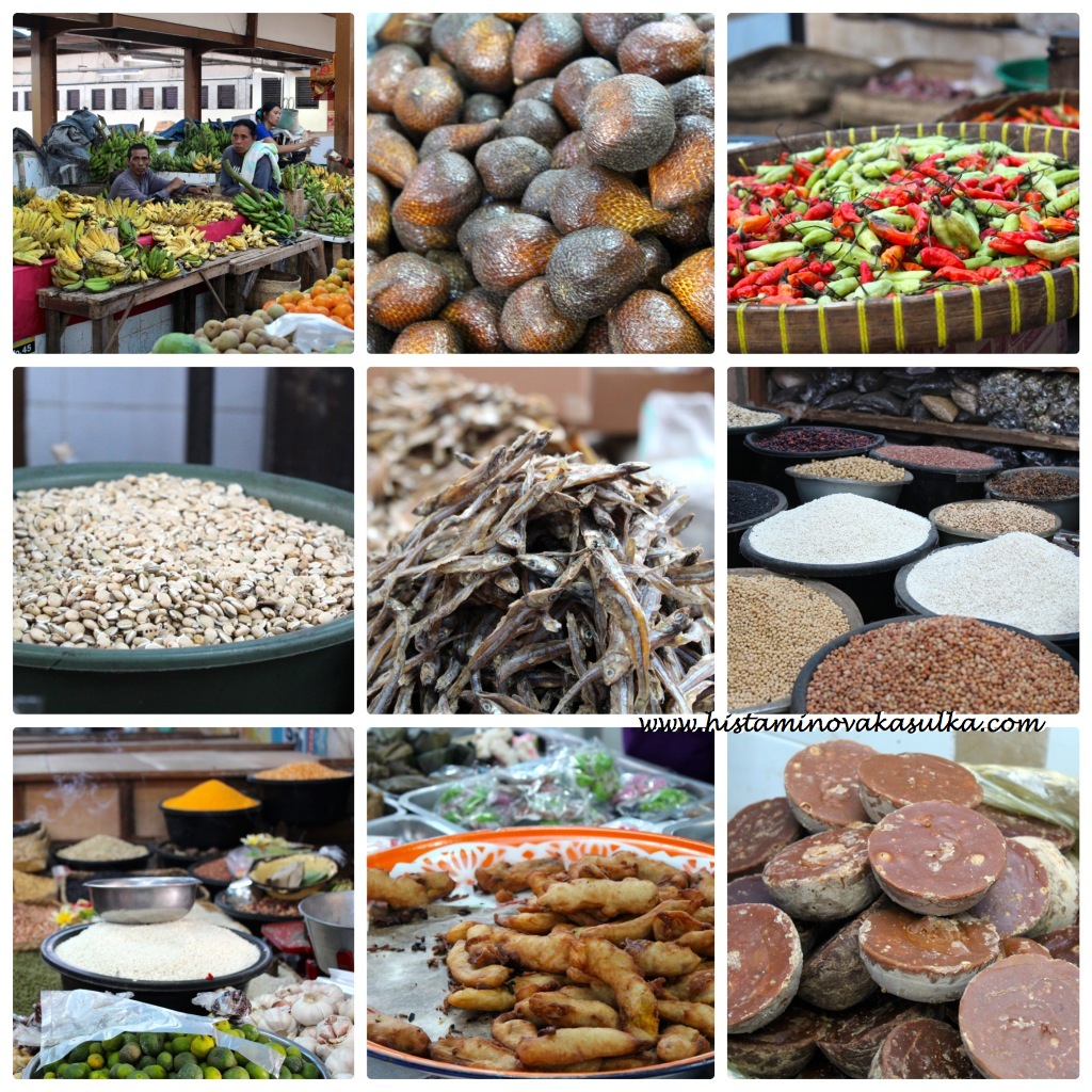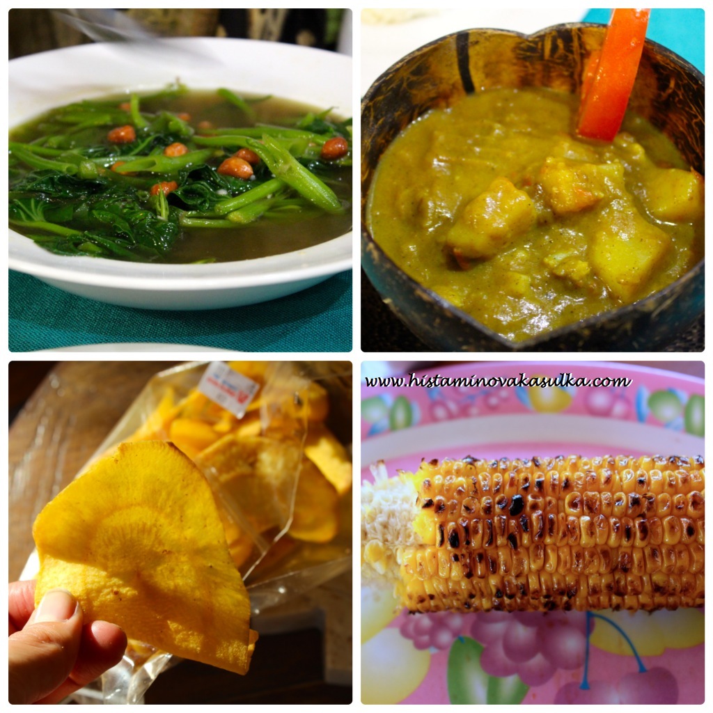 Jinak kdekoli jsem se ptala, karí bylo vždy bezlepkové, nezahušťované moukou, obvykle jen dovnitř rozvaří nějakou zeleninu či brambory. Na některých místech byla „omáčka“, tedy ono karí, úplně tekuté a bylo jasně vidět, že nebyla zahuštěna ničím. Čeho jsem se první bála byl Plecing kangkung či polévka, kterou připomínal, protoře nám paní řekla, že je to uvařeno ze špenátu. Až později jsem zjistila, že se jedná o vodní špenát, který s tím naším strašákem nemá nic společného (naopak je příbuzný batátům). Mezi sušenými plody najdetetémě vše od fialových batátů k banánům v medu. Je to taková malá záchrana. A kukuřice na špejli, tu také obvykle nejde moc zkazit:)).