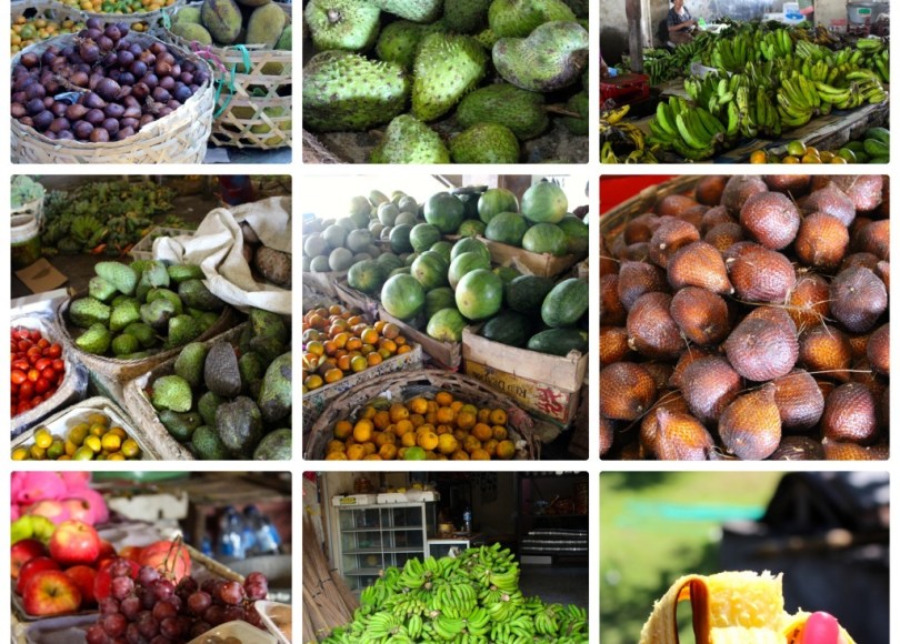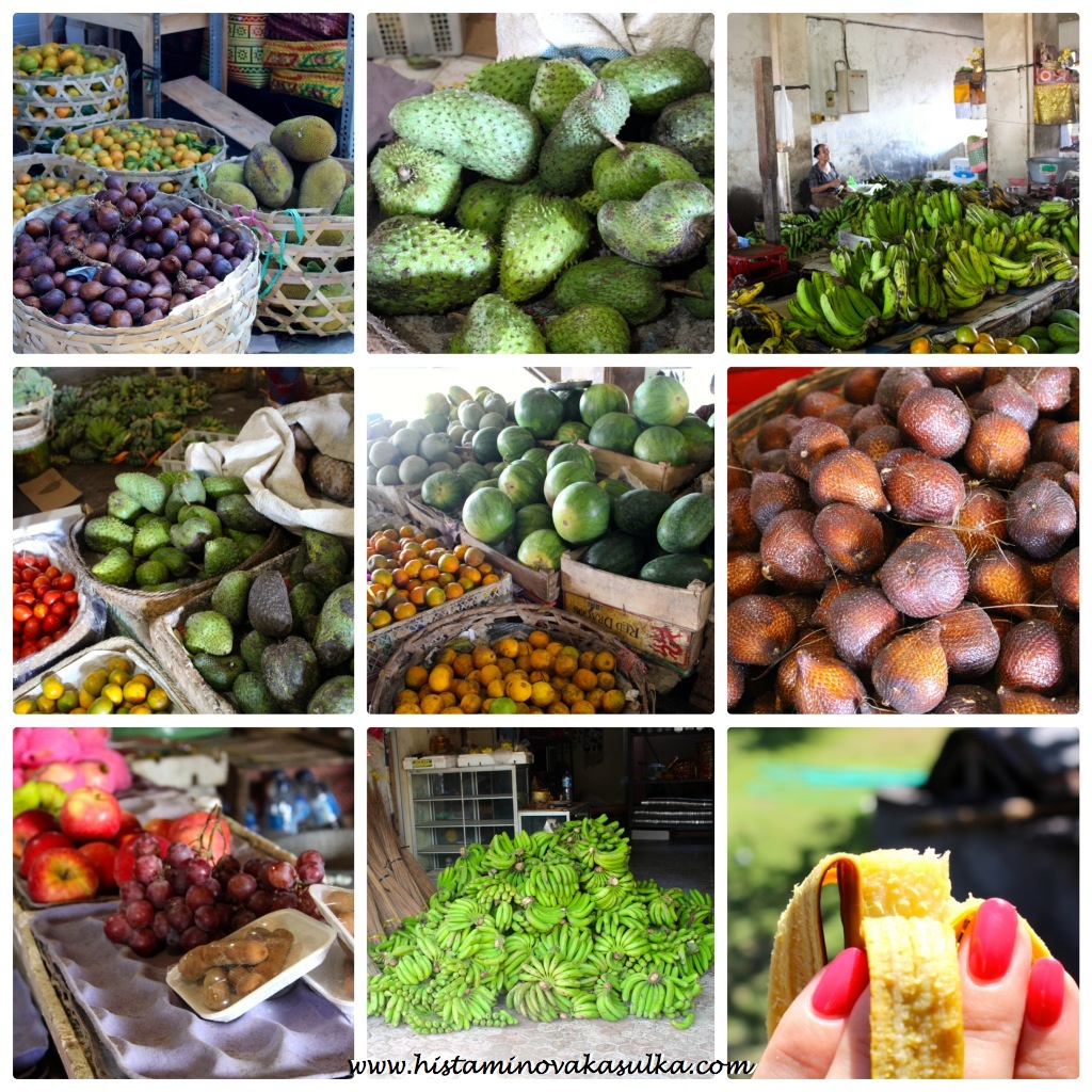Na trzích je k dostání celá řádka výborného ovoce a zeleniny (nabídka se řídí sezónou), některé ceny jsou vyšší, jiné nižší a velmi často se vás budou snažit „obrat“, tedy vlastně jen prodat za vyšší cenu. Je dobré se předem zeptat místních, kolik dát za trs banánů a kolik za chlebovník. Každopádně zkoušejte smlouvat, oni prostě rádi smlouvají. To fialové na obrázku nahoře je tmavý dragon fruit, dračí ovoce, a je rozhodně lahodnější než ten s bílou dužinou. Určitě si dejte mango, passion fruit (mučenku) nebo třeba chlebovník (jackfruit). Doporučuji vyzkoušet i snakefruit, tedy hadí ovoce, které jsem jedla poprvé a je naprosto skvělé.