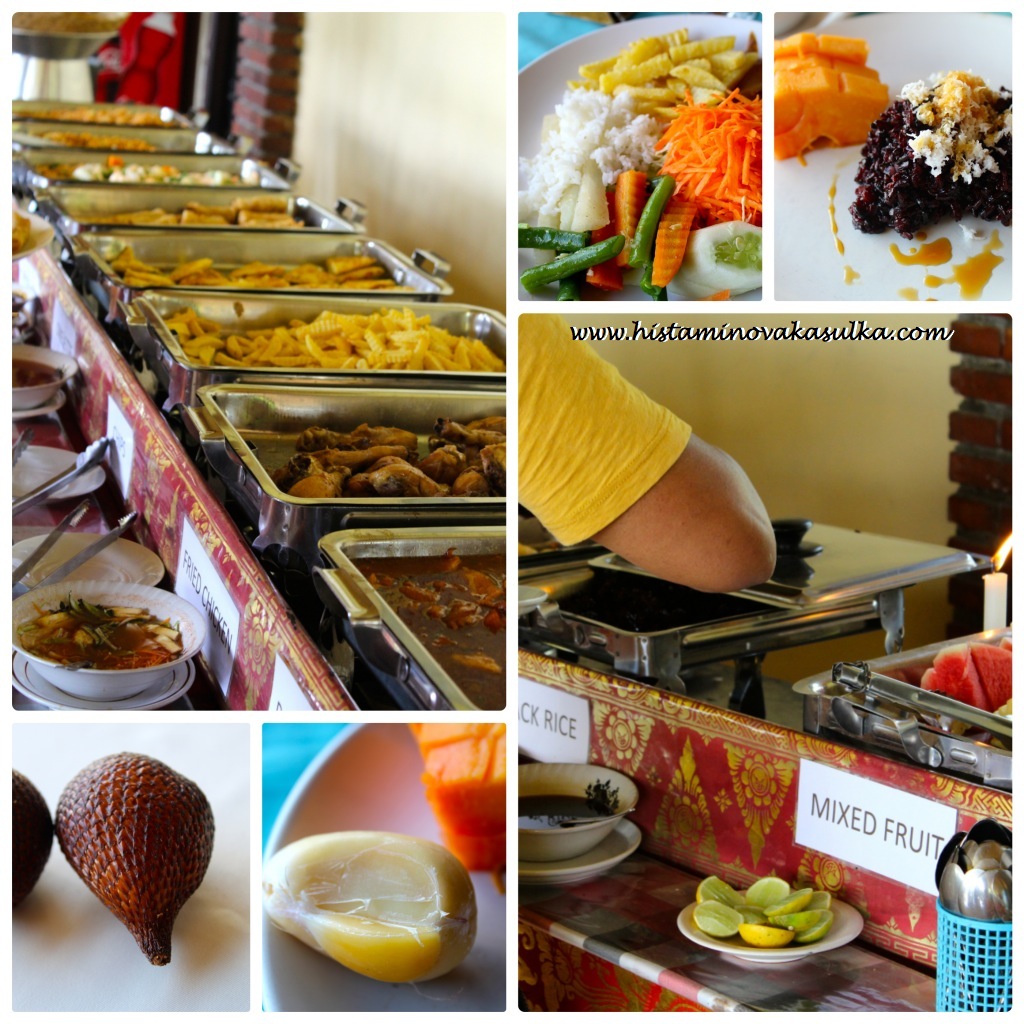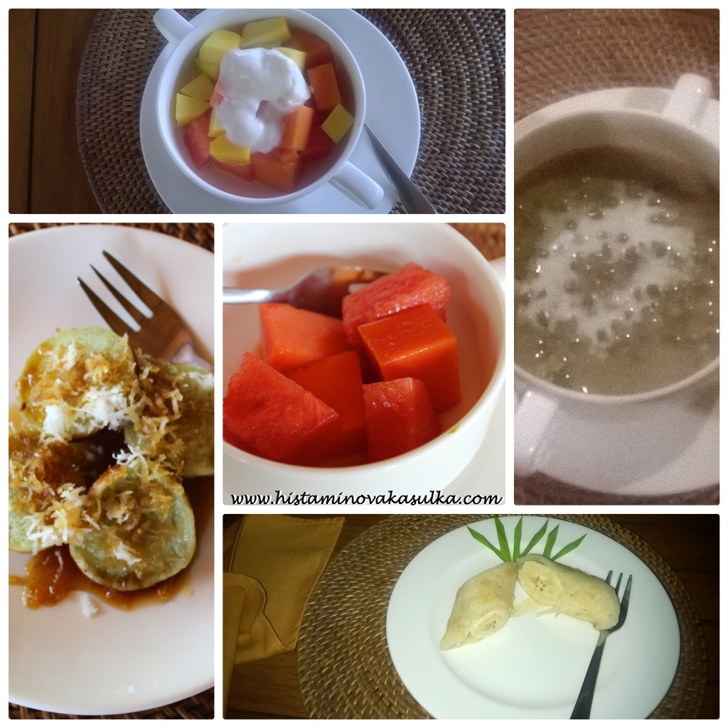 A ještě než se vrhnu k vaření, tak se zmíním o tom, jak nám vařili v retreat centru Nirarta. Měli jsme snídaně, obědy a večeře. Snídaně jste mohli zkouknout v předchozím příspěvku, jako předkrm bylo ovoce a pak si člověk mohl vybrat. Ale na žádost mi klidně nahradili druhé jídlo další dávkou ovoce:)). Na oběd a večeře byl obvykle bufetový styl, tedy k rýži jste si mohli vybrat z dalších pár jídel. Na naši žádost pak začali dávat zálivku bokem od salátu (takže jse zeleninu mohla i já). Takže jsem ochutnala některé balijské speciality (vše dělali na žádost bez lepku, jen nudle a některé dezerty nedokázali připravit jinak a tak mi nabídli ovoce s medem). Vyzkoušela jsem třeba chlebovníkové karí, kukuřičné smaženky, plecing kangkung a další zeleninové směsi.