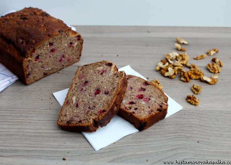 Pokud hledáte velmi rychlý a jednoduchý recept na snídani, svačinu, dezert či třeba klidně večeři, který vás tak trochu zimně naladí, pak tady jeden mám. Vznikl tak nějak sám z mouk, které byly po ruce, neobsahuje ani vejce ani kravské mléko. Ano, nebudeme si lhát, je trochu hutnější, ale ani jsem se o nic jiného nesnažila (je totiž také samozřejmě bez kvasnic či kvásku). Čirok, pohanka i cizrna jsou všechno přirozeně bezlepkové plodiny, které mají protizánětlivý potenciál. Brusinky tomu přidají trochu ze svého protizánětlivého kyblíčku (moje brusinky byly malé české a zamrazené z léta, ne jako ty mega americké:)) a skořice sem patří též. Teď před Vánocemi je skořice aktuální téma a tak si zopakujeme, že už dávno byla vyřazena ze seznamu histaminových potravin, protože histamin neobsahuje a dokonce pomáhá zabraňovat uvolňování vlastního histaminu. Co by vás mohlo zarazit a může být sporná potravina, jsou vlašské ořechy. Vlašské ořechy mohou obsahovat jiné biogenní aminy (proto se také doporučují ve zkouškovém, nejen pro podporu mozkové činnosti, ale proti nervozitě:)), patří mezi silné alergeny a musíte sami zjistit, či vám dělají dobře nebo ne. Já doporučuji samozřejmě domácí a předem namáčené (alespoň 12 hodin pro deaktivaci antinutričních látek). Je také dobré si uvědomit, kolik v takovém plátku či dvou ve skutečnosti sníte. Podle mě k Vánocům prostě patří, ale není problém je vyměnit třeba za blanšírované mandle.