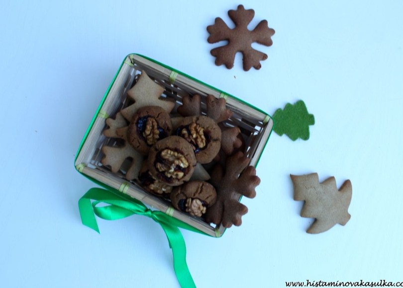 A co se týče marmelády, já jsem zvolila domácí (velké podravy do Lázní Bohdaneč, je prostě skvělá!), takže mám jistotu, že v ní není nic prapodivného, co bych tam nechtěla. Každopádně když bych neměla jistotu, použila bych prostě rybíz a chia semínka. Takto vytvoříte velmi rychle čerstvou marmeládu, kterou můžete do hrudek plnit až těsně před Vánocemi (uděláte si dírku, takto upečete a pak před Vánocemi hezky naplníte čerstvou marmeládou a ozdobíme ořechem). Abyste měli lepší představu, jak na chia marmeládu, tak kukněte sem.