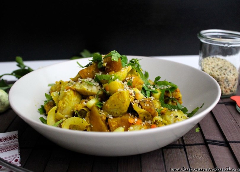 Ať už vaříte jídlo den dopředu nebo ten samý den ráno, určitě oceníte něco, u čeho nemusíte dlouho stát. Takže vám představuji jídlo, které si ráno dáte vařit (suroviny můžete očistit den dopředu), stihnete si zacvičit, hodit sprchu a jídlo na vás bude čekat uvařené:). Je založeno na protizánětlivých rostlinných surovinách, plné léčivého batátu, kapustiček, DAO stimulujícího olivového oleje a protizánětlivých bylinek. Červená čočka patří mezi luštěniny, které potenciálně obsahují histamin a jiné antinutriční látky, ale patří mezi jedny z nejlépe stravitelnějších (a při správné přípravě se není důvod bát). Pokud jste však více citliví na jídlo, dejte ji předem namáčet a vždy dobře promyjte.