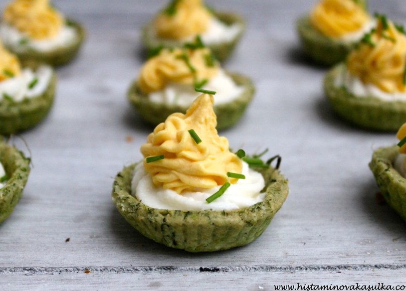 Vejce uvařená na tvrdo rozdělíme na žloutky a bílky. Bílky rozmixujeme s ricottou a pár lžícemi vody a špetkou soli do hladkého pevného krému (vodu přidáváme postupně). Žloutky našleháme s troškou vody a soli a povoleným máslem. Naplníme do pevných sáčků s odstřihlým rohem nebo zdobících sáčků, do spodní části naneseme bílkový krém, na něj přidáme žloutkovým krém a dozdobíme čerstvou pažitkou. Ideálně před konzumací necháme pár hodin v lednici odležet, aby trochu změkly košíčky (jinak budou hezky křupavé). Dobrou chuť.