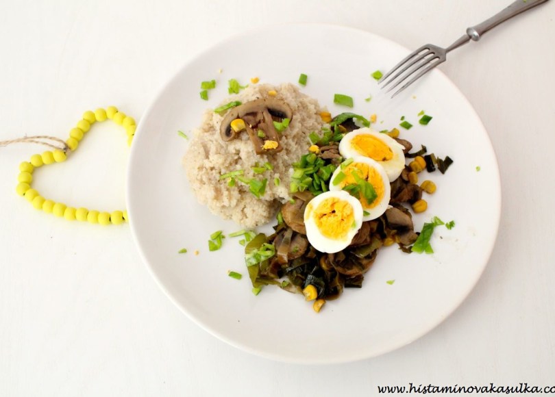 Ideální je, když dáte vše připravovat najednou, takže po 20 minutách máte vše připraveno. Vejce dáme vařit na 10 minut do vroucí vody, poté prudce ochladíme a před podáváním oloupeme a nakrájíme na plátky. Vodu (případně rostlinné mléko) dáme do hrnce s cca 1/4 lžičky himalájské soli, rozmarýnem a mletým kmínem, přidáme obilí, přivedeme k varu a na mírném plameni cca 2 minuty povaříme za stálého míchání, poté odstavíme a necháme přikryté dojít pod poklicí (15-20 minut). Žampiony omyjeme, nakrájíme na plátky a opražíme na lžíci ghí, přidáme nasekaný pórek, opékáme další 2 minuty, posypeme špetkou soli a špetkou mletého pepře. Přikryjeme a necháme podusit cca 10 minut. Naservírujeme či smícháme dohromady a podáváme. Dobrou chuť.
