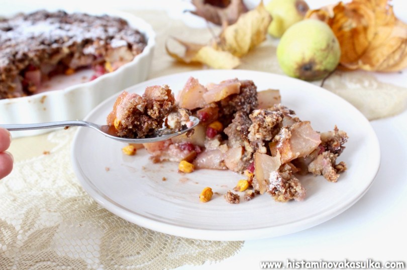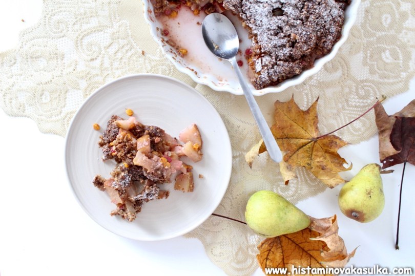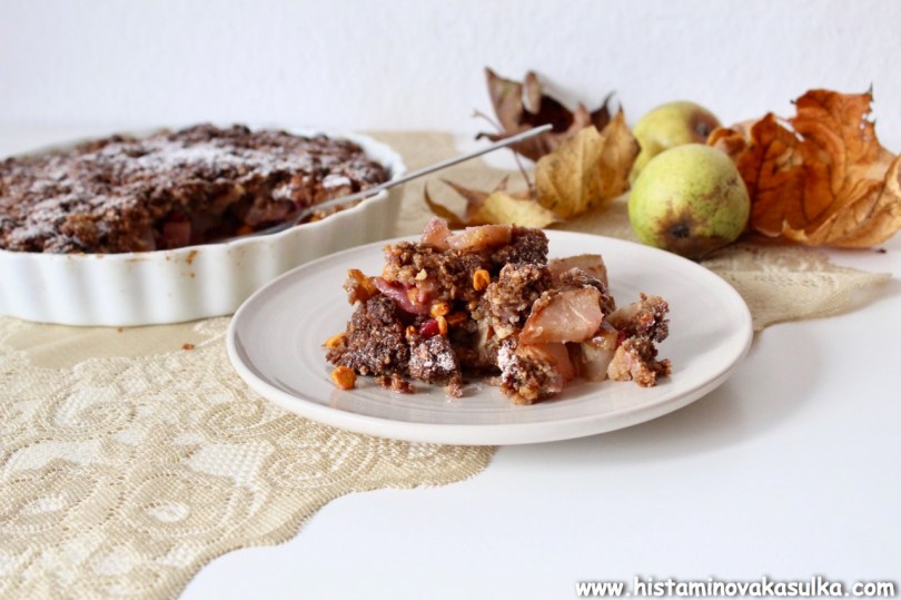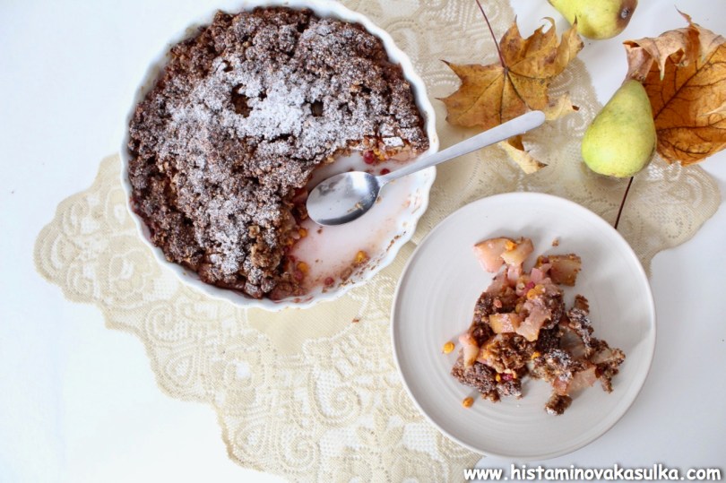 Kniha je plná hezkých receptů a já si nakonec pro představení vybrala Crumble z letního ovoce. Ale jelikož už není léto a jelikož pár z vás by si mohlo stěžovat, že to a to netoleruje, zvolila jsem to, co zrovna bylo dostupné, abych vám ukázala, že si můžete ovoce klidně zaměnit podle vlastní tolerance. Sami autoři receptu vás k tomu nabádají, protože krambl bude fungovat z jakéhokoli sezónního ovoce nebo prostě toho, co vám dozrává na zahrádce. Také jsem zaměnila pohankovou mouku za pohankové vločky, trochu ubrala na cukru, protože moje ovoce bylo sladší, prostě poměr surovin si lze krásně upravit. Příprava vám zabere 10 minut, budete péct 30-40 minut a pak už si můžete pochutnávat. Výborný je ještě teplý, zvláště v zimních měsících.
