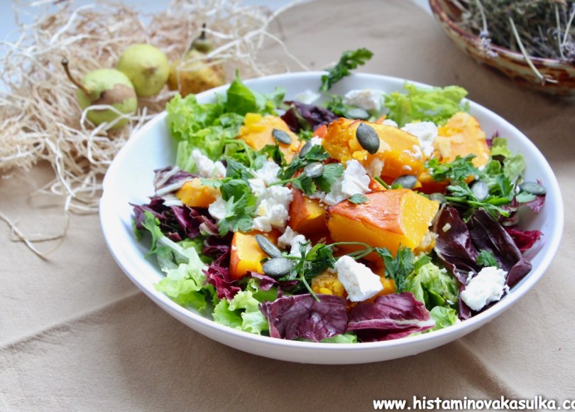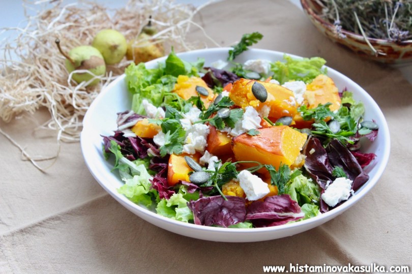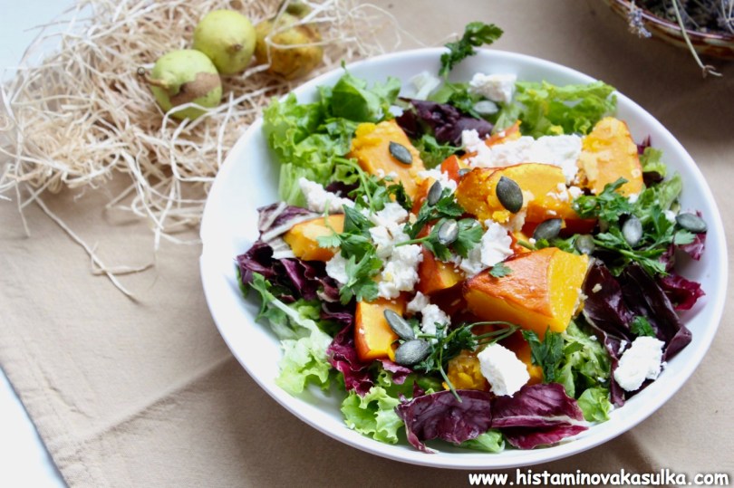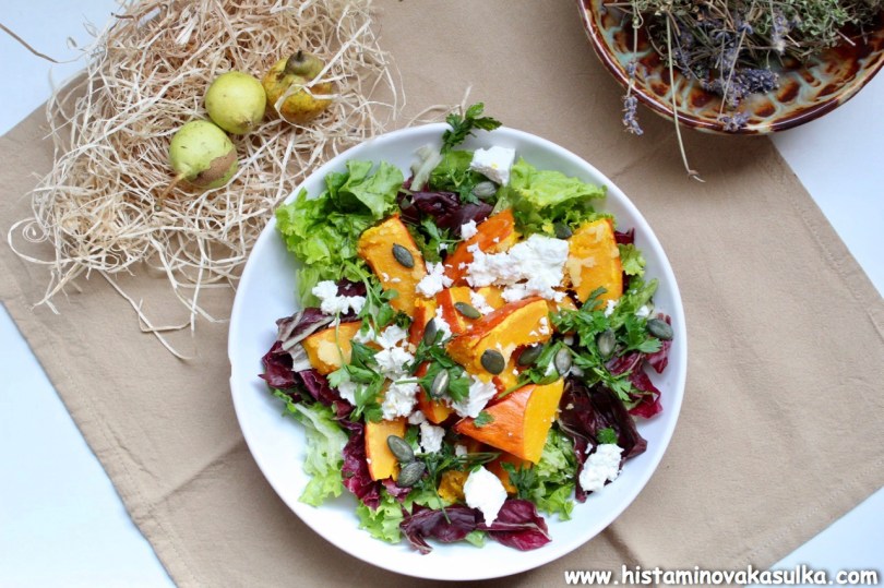 Receptů na salát s pečenou dýní jste viděli desítky. A tenhle se ničím neliší, protože je prostě strašně jednoduchý a rychlý. A není na něm dokonce nic specialního. A proč jej sem tedy dávám? Abych vás motivovala, že dýně je zdravá, má spoustu léčivých účinků a že je zase na čase ji vytáhnout a využít. V tomto případě ji zkombinujeme s česnekem, který už našl předci využívali jako přírodní antibiotikum a podporu imunity, což se nám i na podzim a v zimě hodí. Kombinace čerstvé a pečené zeleniny je navíc velmi chutná. Pokud tolerujete kozí sýry, pak můžete vyzkoušet nějaký čerstvý sýr. A skvělé je, že když pokaždé zkusíte třeba jiný olej a pokaždé zkusíte jiný sýr, dostanete úplně jinou chuť. Osobně si myslím, že chuť pečené dýně se špetkou soli a kapkou oleje je jedna z nejlepších pochoutek, co můžeme rychle vytvořit.
