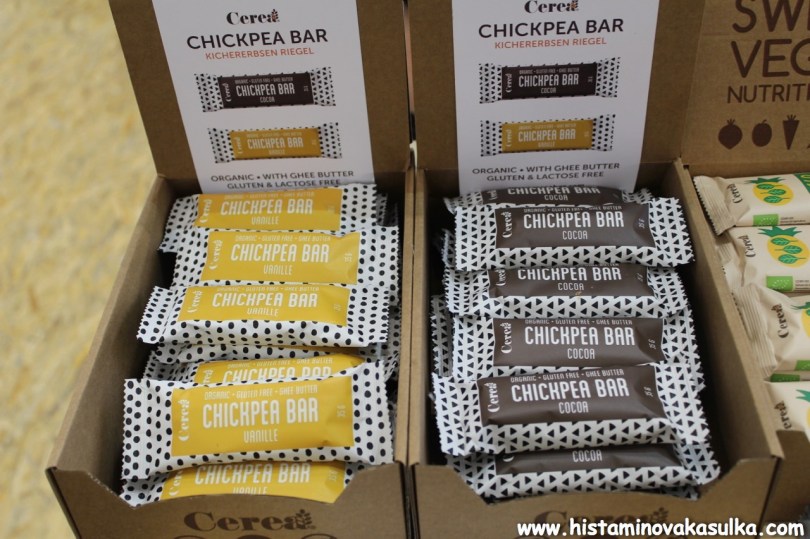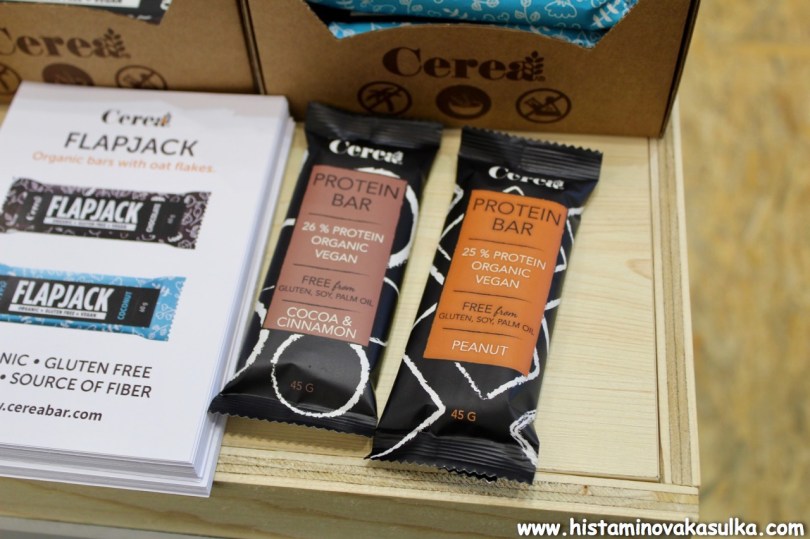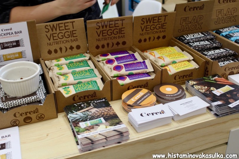 Na veletrhu byli také zástupci firmy Semix, kterou můžete znát z běžných obchodů, dělají teď děsně roztomilá mysli srdíčka, ale jelikož nejsou z bezlepkového ovsa, tak jsem nechutnala. Vyrábí také bezlepkové chia kaše, kde je však spousta cukru (a siřičitany, takže pro HIT nic), slanou čočkovou kaši, kde je zase podle mě úplně zbytečně maltodextrin (více o jeho vlivu na mikrobiotu zde), proteinové kaše (jsou lepkové, ale neobsahují přidaný cukr, jen xylitol, a to až ke konci složení). Milým objevem bylo, že se do toho řádně opřela firma Cereabar, a představila nové tyčinky z cizrnové mouky, které jsou tak nové, že ještě neměly popisek, protože čekaly přesné výsledky analýzy. Každopádně každý znalec indické kuchyně vám potvrdí, že kombinace cizrny a ghí je prostě boží (je v nich prý snad ale kukuřičná mouka). Ke své bio sérii ovocno-zeleninových tyčinek mají i nové bezlepkové flapjacky a také – ano – chutné proteinové tyčinky z rýžového proteinu (samo bez lepku). Prostě pro bezlepkáře slušná nabídka, ke všemu v bio kvalitě.