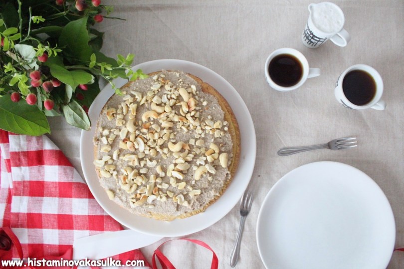 Kešu ořechy spolu se zbylými ingrediencemi na krém rozmixujeme do hladka a potřeme vychladlý koláč. Dozdobíme nasekanými kešu ořechy, které můžeme předem na suchou opražit. Podáváme třeba s čerstvým ovocem nebo i bez něj. Dobrou chuť.
