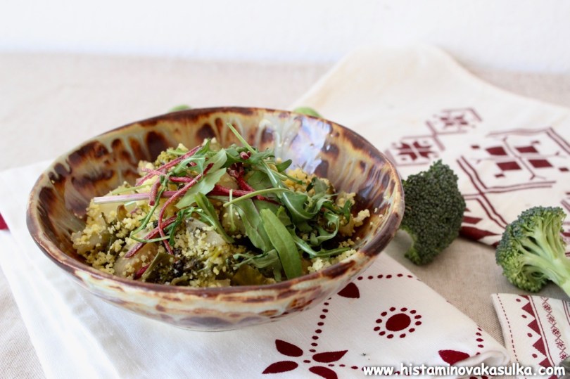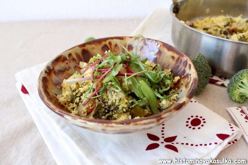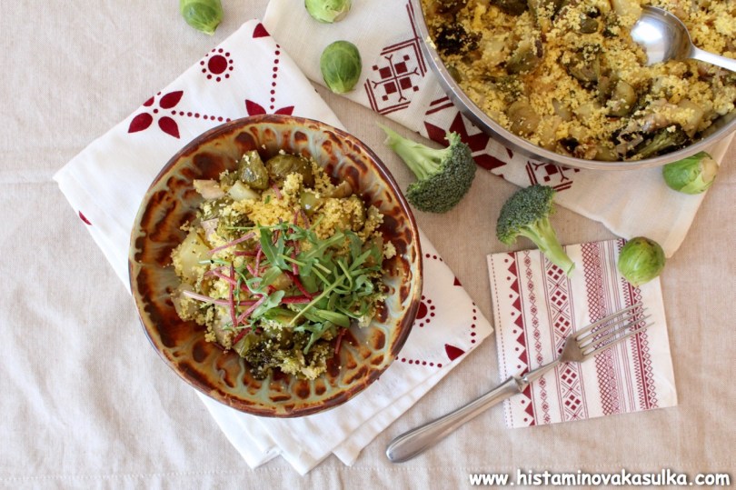 Dneska mám pro vás recept, který možná některé z vás trochu překvapí. Každopádně je jednoduchý, když si napečete zeleninu dopředu, tak bude i super rychlý, je bez lepku, mléka i vajec, dokonce ani žádné ořechy a semínka, pokud si je sami nepřidáte. Není to sice jídlo, které bych chtěla jíst denně, i když je spíše plné zeleniny, která vyváží jakýkoli zánětlivý potenciál ostatních složek. Je to jídlo z kategorie velmi jednoduché, takže zvládnete do přípravy zapojit i děti a zvládne to i každý začátečník. Samozřejmě pokud byste chtěli jídlo ještě rychleji nebo pokud nemáte doma troubu, klidně můžete zeleninu jen podusit. V tom případě bych doporučila přidat trochu více koření a vmíchat kvalitní za studena lisovaný olej až na závěr přípravy. A uvidíte, že jídlo bude stejně dobré. Když zeleninu nakrájíte na menší kousky, podusí se vám poměrně rychle, bezlepkový kuskus je k tomu v cuku letu, takže opravdu rychlá večeře. A pokud máte doma třeba nějaké uvařené luštěniny, můžete je také vmíchat, dodáte tím jídlu bílkoviny i vlákninu.