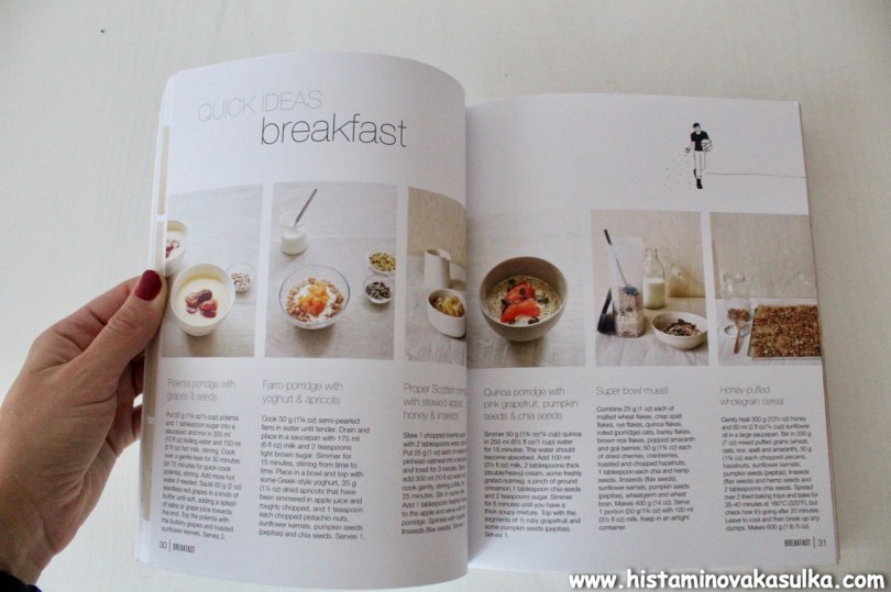 Pak už přímo následují recepty, které jsou rozděleny jako snídaně, polévky, saláty, večeře, přílohy atd. Každý recept je doprovázen krásnou fotografií, podle které se vám rozhodně budou sbíhat sliny. Naučíte se připravovat kaši přímo s různých druhů obilnin, připravovat granolu i musli, ale rozhodně tedy nečekejte recepty bez cukru nebo tuku. Celkově jsou recepty takové klasické, najdete v nich často máslo i mléko, různá sladidla či spoustu oleje. Vafle, palačinky, pravé blini nebo lívance, nebo klidně něco lehčího jako různé typy na smoothie. Snídaně jsou rozhodně tou bohatší částí dne:).