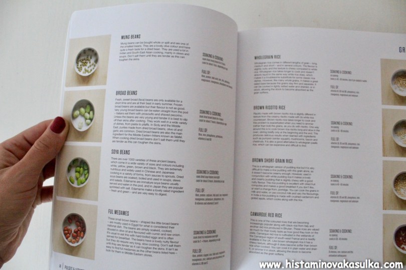 Kniha není primárně bezlepková a budete se tedy učit pracovat i s normálními lepkovými obilninami, ale najdete dost informací i o těch bezlepkových. Každopádně pokud se vám moc nechce recepty předělávat, nebude to to pravé ořechové pro bezlepkovou kuchyni. Na začátek knihy vás čeká seznámení se s jednotlivými druhy semínek, co obsahují a jaká je jejich nejlepší příprava pro konzumaci, pak se dozvíte o luštěninách, jak kterou namáčet a vařit (je tam většina běžných fazolí, které však většina lidí ani znát nebude) a pak už obiloviny. Na druhou stranu u většiny obilnin nemají doporučení pro namáčení, což je podle mě škoda, zvýší to jejich stravitelnost i vstřebatelnost živin (ale třeba kamut, žito i pšenici doporučují přes noc namáčet). Osobně bych čekala více informací v tomto směru, když se tak kniha jmenuje, ale je to spíše kuchařka.