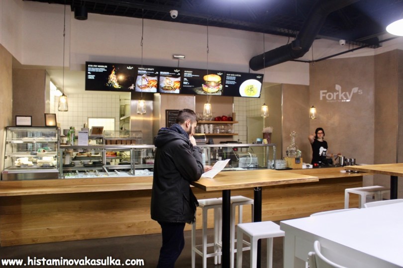 My jsme ještě navštívili starou provozovnu Forky´s, která se právě díky velkému počtu zákazníků bude přesouvat do větších prostor (možná se v době vydání tohoto článku už přesunula:)). Věřím ale, že bistro bude stejně krásné jako to původní. Původní provozovna v Brně byla hezká, otevřená a světlá, tedy poměrně příjemná, i když to není běžná restaurace. Dostanete číslo a jídlo vám potom donesu na tácku, což je takový jako oldschool, ale funguje to. Součástí je také menší obchůdek, kde si můžete koupit nějaké veganské čokolády nebo jiné pochutiny na cestu domů. Navíc díky plánovanému přesunu do větších prostor, které jsou jen kousek do původních, chtějí otevřít také lahůdkárnu a vlastní pekárnu a mít tak trochu i kavárenský prostor (v druhém patře se prý plánují večerní jízdy a dýchánky na baru):).
