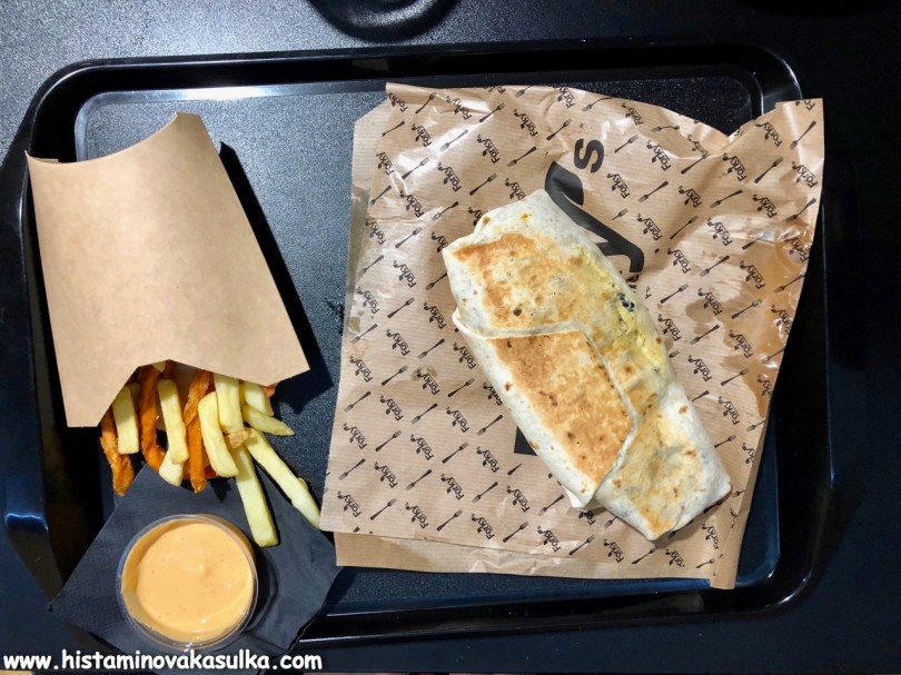 Superbowl jsem si samozřejmě vytunila cizrnou, jinak jsem nic nepřidávala, i tak to bylo moc dobré. Zeptají se vás, zda tam chcete třeba čerstvou cibuli nebo chilli papričky a pokud si nejste jistí, vždy zdůrazněte, že žádná zálivka nebo nic z octového nálevu (opatrnost při HIT není nikdy na škodu). Jak sami vidíte, miska je plná zeleniny a quinoy a cizrna byla ochucená a celkově to bylo moc dobré. Hummusový wrap bohužel bezlepkový není, ale byl prý naprosto výborný. K tomu v menu dostanete i mix hranolek z brambor a sladkých brambor a nějaký dip.
