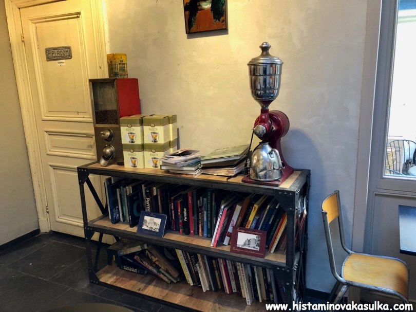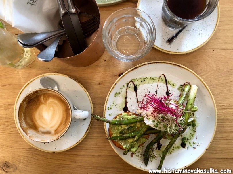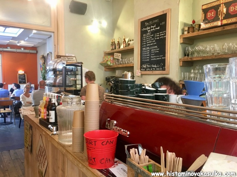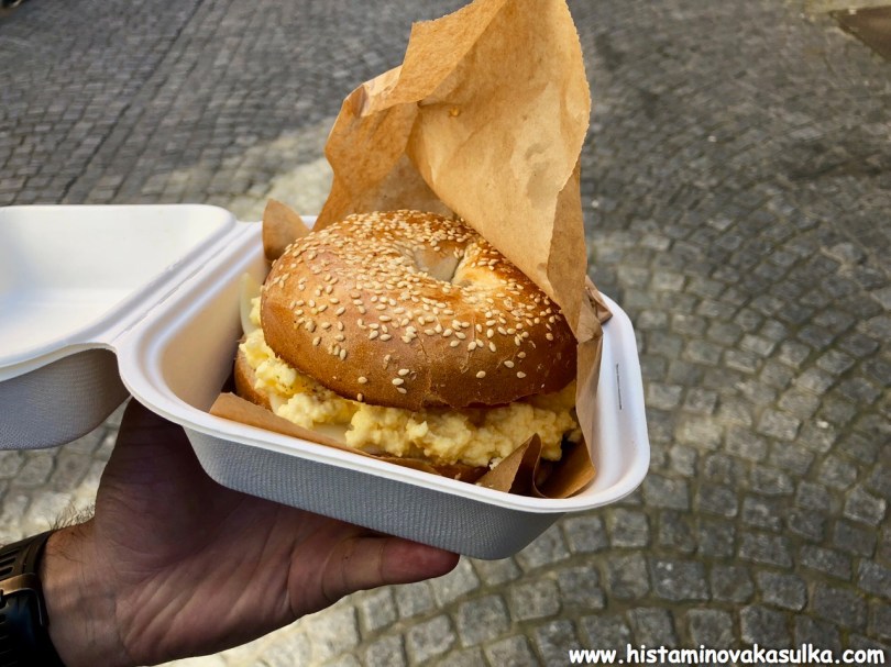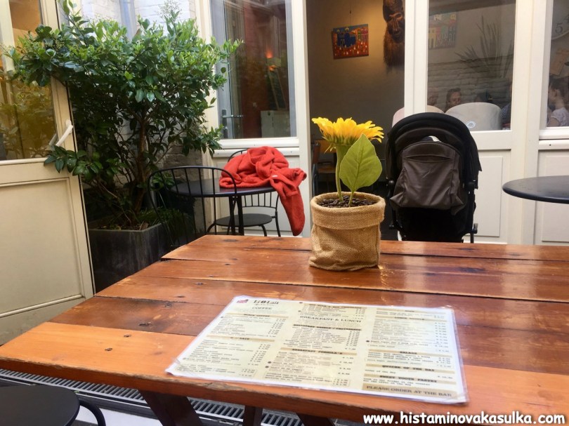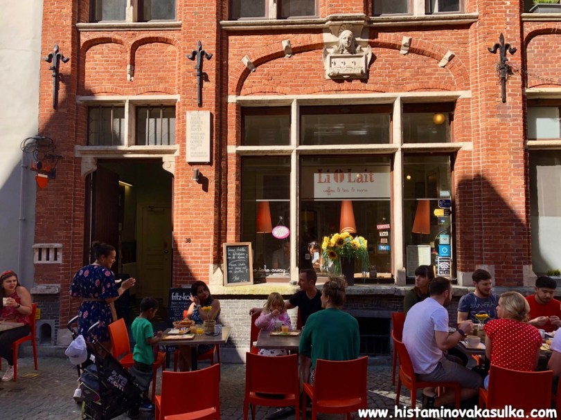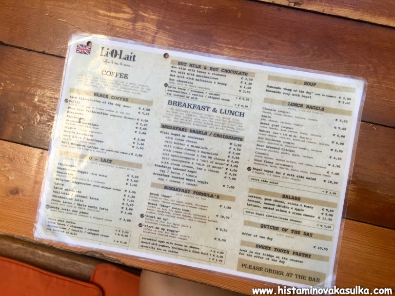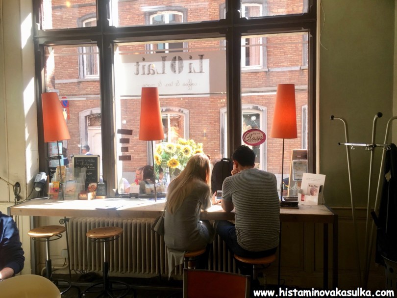 Protože další kroky směřovaly do města a byli jsme celou dobu mimo domov či nějaké ucházející zařízení, zaplácli jsme hladové žaludky nějakým tím hranolkem, můžu pak ještě doporučit zase takové spíše snídaňové/brunchové místo, které nese hezký název Li-O-Lait. Bohužel nemohu moc referovat o jídle, chystala jsem se ochutnat jejich bezlepkové sušenky, které peče přímo majitel, ale protože jsme tak trochu nestíhali, vše jim hrozně dlouho trvalo, neměla jsem na konec ani chuť. Takže jsme jen vypili kávu a poprosili, aby zabalili objednaný bagel sebou. No a i to zblbli a místo objednaného se šunkou tam hodili vegetariánský. Tak jsem si říkala, že ten vegetarián musel být pěkně naštvaný, jestli dostal jeden se šunkou. Každopádně bagel vypadal dobře, byl šťavnatý a prý chuťově velmi dobrý, tak pokud sebou máte nějakého lepkaře, tak si neváhejte jeden objednat. Káva byla ale moc dobrá, místo je takové hezky útulné, v zadní části zase najdete malý dvoreček s pár stolečky. Takže pokud byste měli chuť na sušenku a kávičku, tak se vám tady určitě bude líbit.
