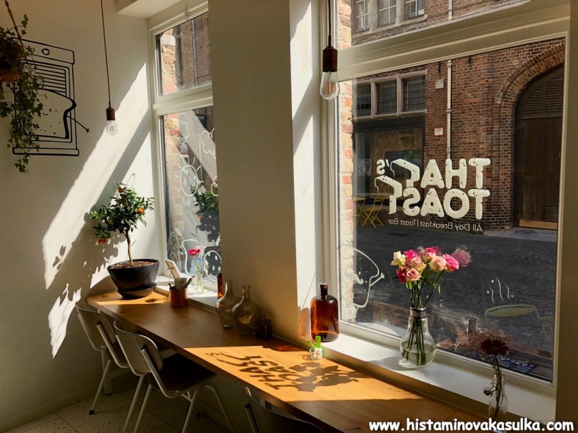 Jo, přesně, jsem milovník Brugg. A to jako velký. Já vím, kýč sem, kýč tam, ale mě se to městečko prostě líbí. Je skvěle rozloženo, dá se vše projít po vlastních nohou, má dva pivovary se skvělou prohlídkou a výhledem na město a k tomu také, ano, počkejte si na to…hranolky. Veganské a bezlepkové. Sice jsme měli hranolky jen v Bruggách a Gentu, ale i tak vám na konec článku přidám něco u mě naprosto nečekaného: Tour de hranolka. Ale než se do „Tour de hranolka“ pustím, představím vám místo, kde se chcete jít nasnídat, pokud budete mít v Bruggách příležitost (možná nejen na brunch, ale i později během dne). Jmenuje se That´s Toast a pokud máte bezlepkovou dietu a další potravinová omezení, tak tady se budete cítit dobře. Mají poměrně rozsáhlé menu a většinu ze svého menu dokáží připravit v bezlepkové variantě. A nutno říct, že nabídka jejich toastů je velmi zajímavá a lákavá. Krom toho, že mají možnost uzpůsobit jídlo vašim potřebám, protože vše čerstvě připravují před vámi, mají asi 2-3 varianty bezmasé (juhůů), ale i masomilci (slaninomilci) si tam přijdou na své. Bezlepková houska je sice trochu menší než jejich originál chléb, ale tak už jen pro to potěšení, že si člověk opravdu může vybírat z menu, to za to stojí. Můžete si tak dát třeba onen slavný avotoast, pokud víte, že nějaké to menší avokádo tolerujete. Mají i různé lívance a sladké záležitosti, skvělou kávu. Prostor je velmi hezký, vzadu je trochu více místa, než by člověk čekal, ale počítejte s tím, že o víkendu může být poměrně plno, protože je to asi docela oblíbené místo. My jsme měli štěstí a seděli hned vedle otevřené kuchyně a mohli tak koukat, kde a jak se co připravuje. Obsluha byla milá a pozorná, všude roztomilé malůvky toastů, takže určitě hezké místo k posezení.