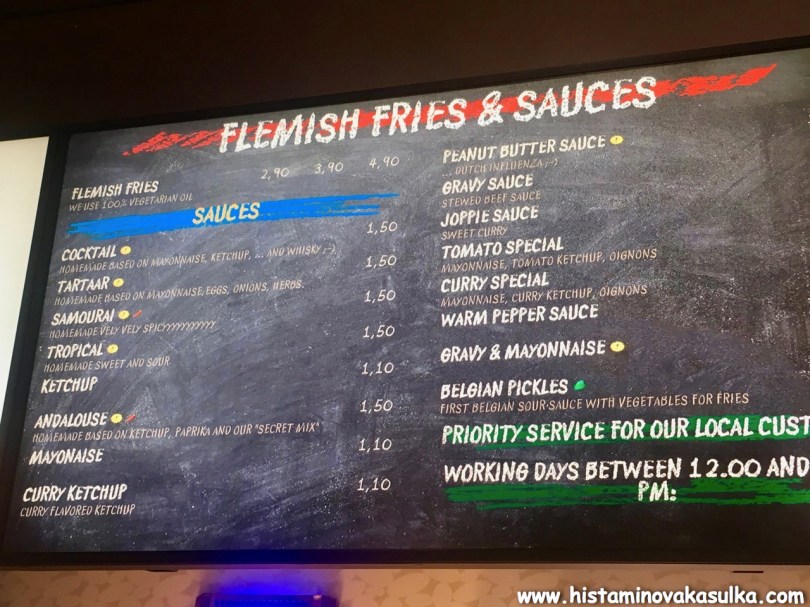 Best Frit je další místo v Bruggách (skoro to vypadá, že jsme se v Bruggách přehranolkovali a pak už sekali dobrotu, ještěže jsem na to nebyla sama), které uvítáte hlavně po ochutnávce piva a při objevování velkých porcí hranolek. Myslím, že mají více poboček, ale už jen podle toho, že zde v deset večer vysedávají místní babičky a krmí se hranolky říká, že to nebude tak zlé. Jestli jste milovníci arašídového másla, tak musíte zkusit jejich arašídovou omáčku.