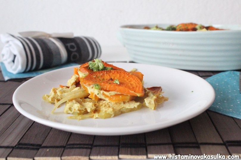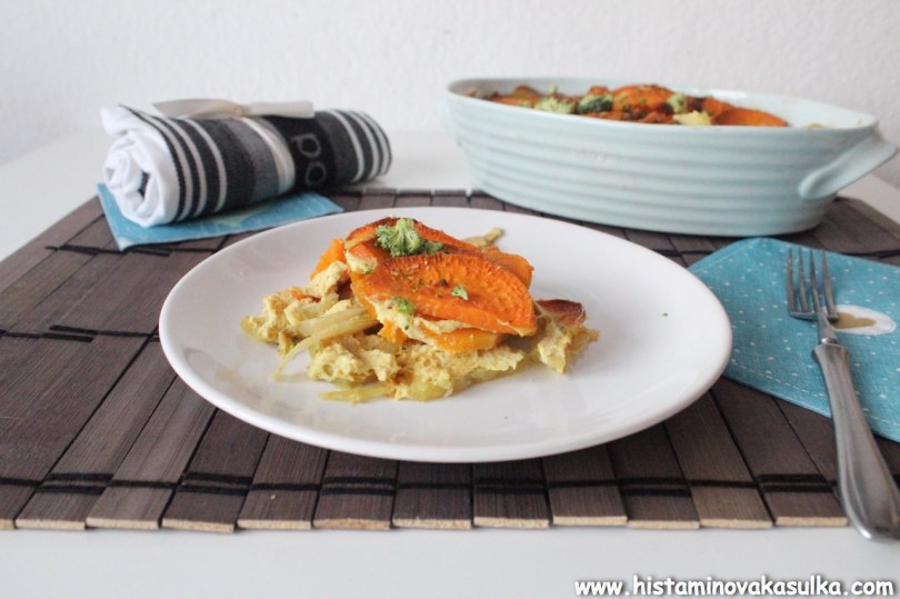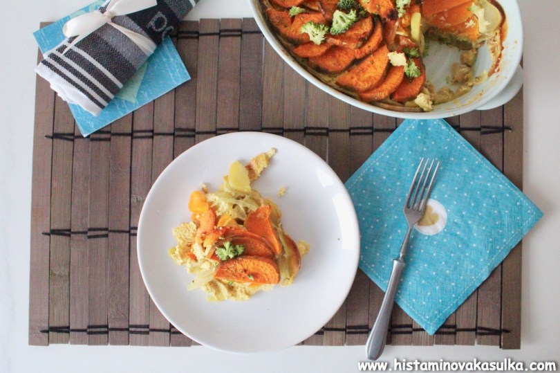 Tyto recepty mám moc ráda, i když nejsou nějak převratné. Je mi jasné, že každý z vás už něco někdy zapékal, ale vždy je fajn si připomenout, že jídlo může být jednoduché a je to jen a jen dobře. Do jednoho jídla přitom schováte spoustu protizánětlivých a nutričně bohatých potravin (batáty, dýně), dodáte potřebný tuk a protizánětlivý kokos, další nutrienty ve vejci a vlastně i nějaké to protizánětlivé koření. Recepty jsou tady od toho, aby nás inspirovaly, nebo aby nám třeba jen připomněly nějaké jednoduché jídlo z dětství i dospělosti, na které jsme pozapomněli a které by nám mohlo chutnat. Možná to některé z vás motivuje zkusit přidat i batáty vedle brambor, někomu třeba zachutná to magické spojení kokosového mléka s tandoori kořením. A někdo otevře lednici a zjistí, že tam má jiné kousky zeleniny a že je může vlastně přidat také.