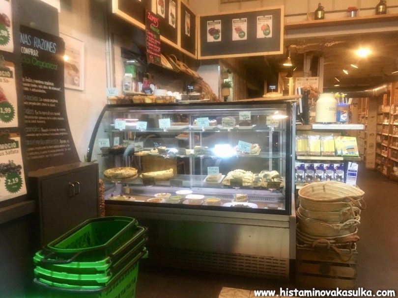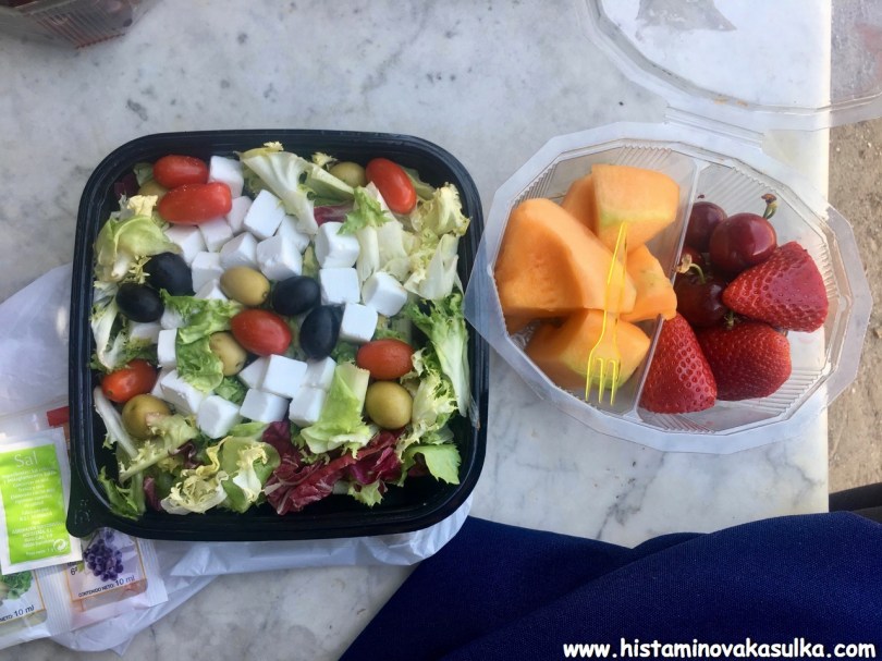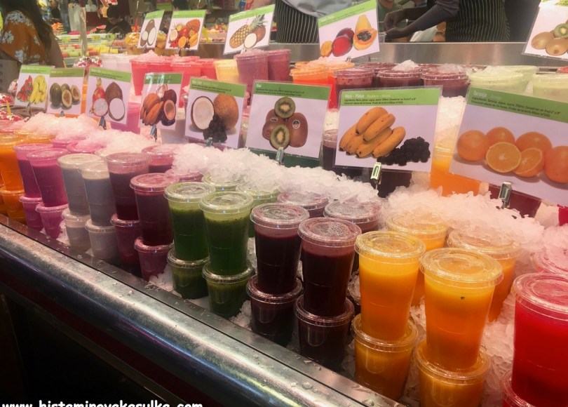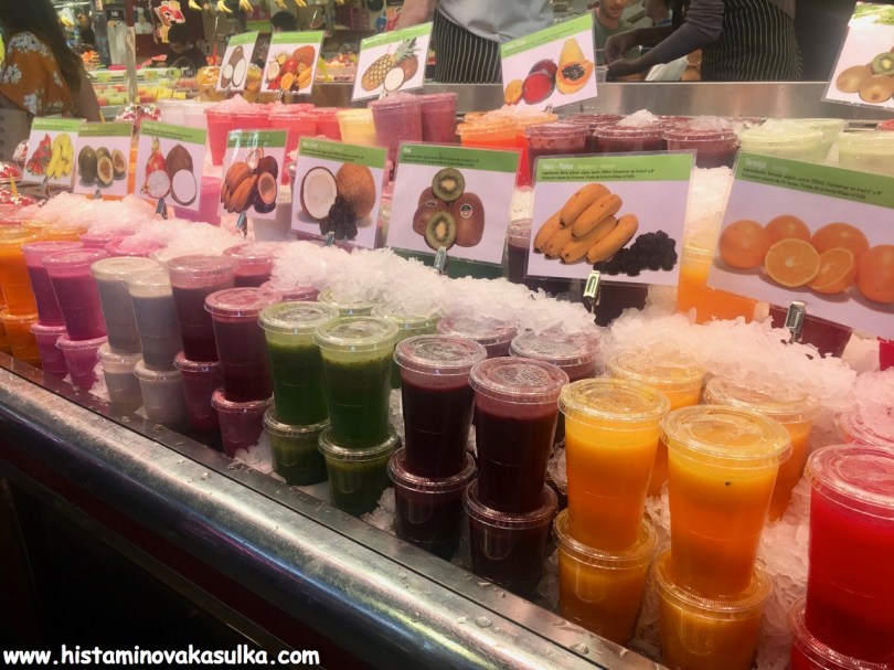 Každý, kdo vycestuje do Barcelony, dostane jistě tip na místní tržiště, Mercat de la Boqueria. Jedná se o trhy, které jsou prakticky v samém historickém centru (tak uprostřed La Rambla), takže počítejte s větším počtem lidí a občas i mírnou tlačenicí. Trh zmiňuji hlavně proto, že zde můžete nejen koupit nějaké pochutiny jako dárky pro své drahé (čokolády, fuety, salámy, sýry, koření), ale můžete se zde i trochu nadlábnout. Většina prodejců nabízí čerstvé džusy, které uchovávají na ledu, ale dejte si pozor. Spousta z nich obsahuje přidaný cukr a většinou je to i v popisku (a člověku zůstane rozum stát, proč proboha třeba do něčeho s mangem je potřeba přidávat ještě cukr). Když se proderete do zadní části, najdete právě i hlavně ty, kde cukr neprodávají, a můžete si tak dopřát opravdu jen ovoce. Najdete zde také hotové saláty, když budete pozorní, můžete využít nějaké kombo slevy, tedy že dostanete salát a džus za lepší cenu. My jsme salát kupovali spíše až v podvečerních hodinách a řekla bych, že už tak fresh zase nebyl, hlavně ovocný salát obsahoval převážně přezrálé plody, takže toho většina letěla do koše. Chápu, že někdo to tak rád, ale pro histaminika nic moc. Každopádně se třeba cení, že rajčata nejsou nakrájená a lze je jednoduše odstranit, sýr je čerstvý a celkově se tak člověk aspoň trochu nají. Pokud vás tedy přepadne chuť na trochu zeleniny a ovoce, tohle místo jistě oceníte. Jinak zde jsou hlavně lákadla pro masomilce a sýromilce, ale to bych histaminikům úplně nedoporučovala.
