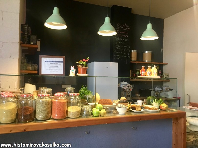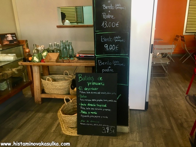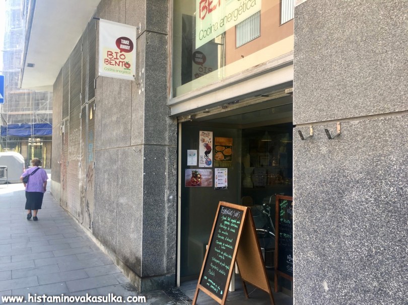 A pak tady máme ještě jeden rychlý tip, pokud se budete pohybovat v oblasti hlavního nádraží. Bio Bento se nachází na Calle Ermengarda a z venku byste vlastně také asi nepoznali, že se jedná o nějaké bistro se zdravou stravou. Ale pokud jste vegani nebo se musíte z nějakého důvodu vyhýbat masu a dalším živočišným produktům, určitě byste měli Bio Bento mít ve svém hledáčku. Vaří čerstvě, není to restaurace, kde si budete vybírat z dlouhého menu, ale musíte se prostě dopředu podívat, co se ten den podává. Původně jsem myslela, že je to jen pultík a vy si musíte jídlo odnést sebou, ale ve skutečnosti je vevnitř pár hezkých stolečků a velmi příjemná atmosféra, ve které si na svém jídle pochutnáte. Samozřejmě jak název napovídá, bude se jednat o bio suroviny. Dát si můžete celé menu, tedy nějaký předkrm v podobě quiche nebo polévky, hlavní jídlo (což může být cokoliv od rizota až po pečenou dýni s omáčkou) a pak zákusek. S paní se dalo dobře dorozumět a na alergeny se jí musíte přímo zeptat, tím, že se vše připravuje čerstvě, dokáže vám vysvětlit, zda je v daném jídle třeba lepek nebo ne. Já jsem nakonec neodolala jednomu z jejich smoothie, protože jsem nutně potřebovala zázvor do svého žaludku a musím říct, že smoothie bylo fakt super. Bylo převážně zeleninové a bylo to cítit, žádný tlamolep. Tak až budete plánovat cestu na vlak, nechte si tam chvíli a skočte si ve všední dny na něco dobrého.