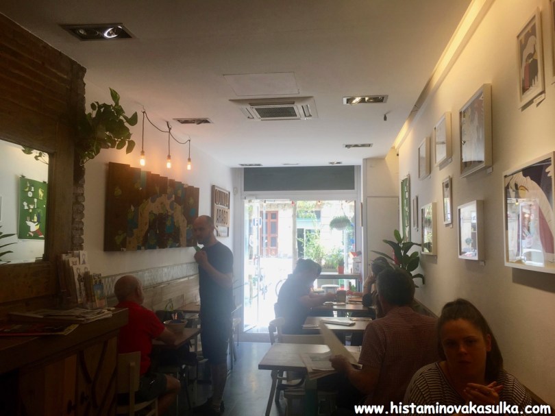 Jak už to bývá, když máte hlad a hledáte ve městě jídlo, na nic nenarazíte a pak, když už nemáte čas, se před vámi z čistajasna objeví Quinoa Aragó Vegetarià (Carrer d’Aragó, je to druhá pobočka Quinoa Bar Vegetarià, který je na Travessera de Gràcia). Menší nenápadné bistro, kde pořídíte vegetariánské jídlo, které chutná báječně. Snaží se řídit pravidly čerstvosti, sezónnosti a do jisté míry řeší i ekologickou problematiku, my jsme však čas neměli a musela jsem si jídlo vyžádat sebou do krabičky. Musím tedy za sebe říct, že takhle božský falafel na salátu jsem již dlouho nejedla. Nabízí nějaká typická jídla, různé bowls a právě ta s falafelem k nim patřila. A byla to skvělá volba. Takže pokud půjdete kolem, stavte se klidně i na něco menšího, jako jsou pečené brambory, nebudete litovat. Obsluha byla vstřícná, menu velmi lákavé a fakt mě mrzelo, že jsem to místo neobjevila dříve, jednoznačně bych se tam pořádně najedla a pak si ještě dala kávu. Angličtina nebyl žádný problém, ale v menu měli označené alergeny, takže člověk se vlastně domluví rukama nohama, co vlastně to potřebuje. Takže za mě velký palec nahoru.