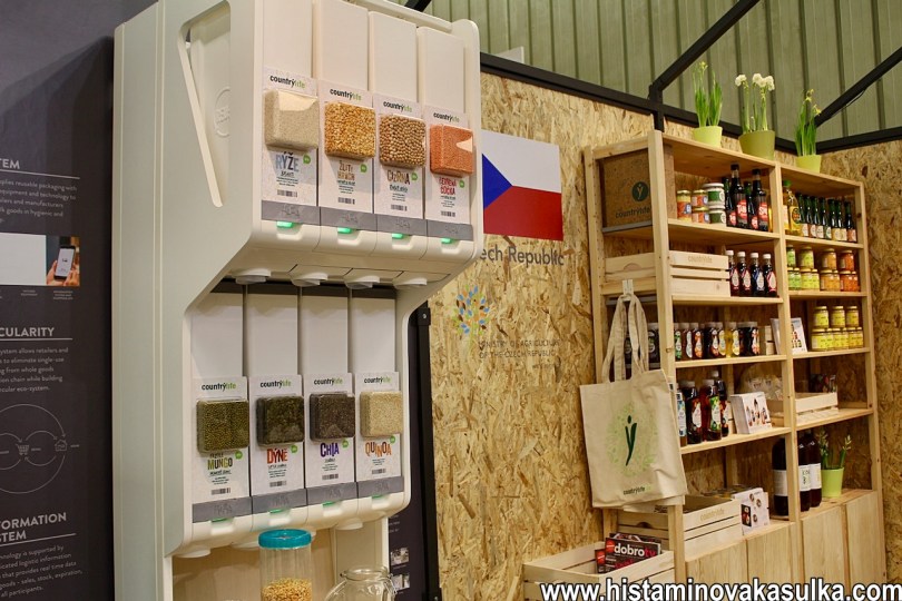 Samozřejmě i zde je dobré zmínit, že to není vše jen o jídle. Když se chcete zaměřit na udržitelné zemědělství, bio produkci atd, měli byste samozřejmě zvažovat, co se děje dál. Jakou obalovou metodu používáte, jaké barvy tisknete, jaký je prostě dopad na životní prostředí i po tom, co výrobek opustí továrnu. K tomu bylo spoustu stánků s těmito nabídkami, ale některé firmy už samy přestupují na neplastové obaly, znovupoužitelné obaly či prodej bezobalový. Takto jsme viděli návrh zásobníků pro bezobalový prodej, který by se měl objevit v Country Life a musím říct, že je rozhodně hezčí než ten původní. Je fajn, že se najdou i firmy, které se právě zaměřují na ekologický dopad naší konzumní společnosti.