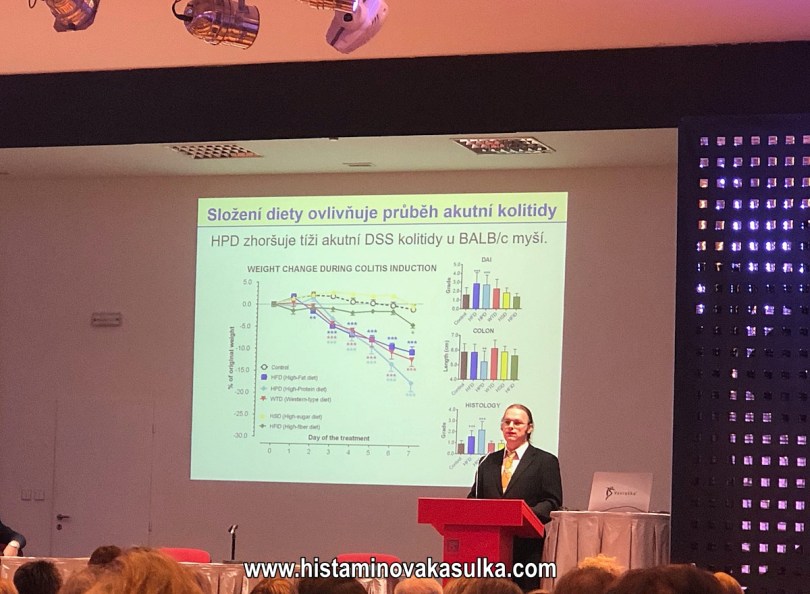 Pan doktor Kverka představil výsledky zajímavého výzkumu, kde zkoumali u myší vliv složení diety na průběh zánětu střeva. Nasadili různou kontrolovanou dietu a následně u myší vyvolali zánět. Nejhorší výsledek a odpověď na léčbu měla dieta s vysokým obsahem proteinu, vysokotuká dieta a západní dieta, nejlepší výsledek odpovědi na léčbu byla u vysokocukrové a vysokovlákninové diety. Samozřejmě musíme brát v potaz, že se jednalo o výzkum na myších. Vysokoproteinová dieta významně urychlila i rakovinné bujení. Jelikož výsledky vysokoproteinové diety byly překvapivé, vyzkoušeli, jestli je rozdíl mezi zdrojem proteinu, tedy zda bílkovina pocházela z rostlinného nebo živočišného zdroje. Ukázalo se, že zdroj proteinu hraje významnou úlohu, negativní dopad měl živočišný protein právě zřejmě díky vlivu mikrobioty. Když totiž využili stejného modely u bezmikrobní myši, rozdíl mezi zdrojem bílkovin nepozorovali. Jejich výzkum tedy ukázal, že strava ovlivňuje citlivost ke střevnímu zánětu, vysoký obsah bílkovin živočišného původu zhoršil odpověď k zánětu v závislosti na mikrobiotě, roli hrály makrofágy.
