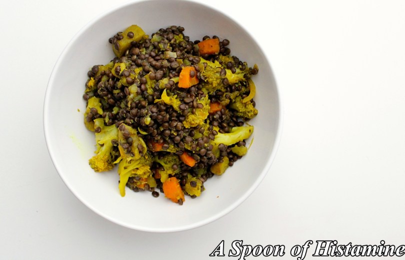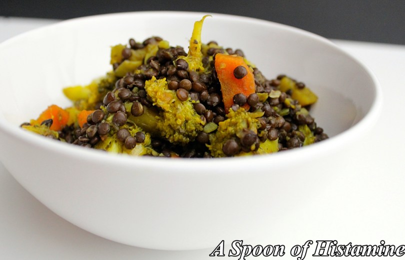 Mezitím oloupeme batáty, mrkev i cibuli. Vše nakrájíme na malé kousíčky. Brokolici rozdělíme na menší kousky. Na pánvi s poklicí rozehřejeme trochu oleje, vmícháme kurkumu a 2 minuty povaříme, poté přidáme cibuli. Chvíli opékáme a vmícháme zbytek zeleniny. Přisypeme koření a nasekané bazalkové listy, podlijeme malým množstvím vody, přikryjeme a dusíme cca 25 minut (než se nám dovaří čočka v druhém hrnci a tak, aby batáty změkly). Opět vyvaříme případnou přebytečnou vodu a vmícháme uvařenou čočku. Ihned podáváme, pokud tolerujete, můžete klidně přidat nasekané uvařené vejce nebo přisypat trochu konopného semínka. Dobrou chuť.