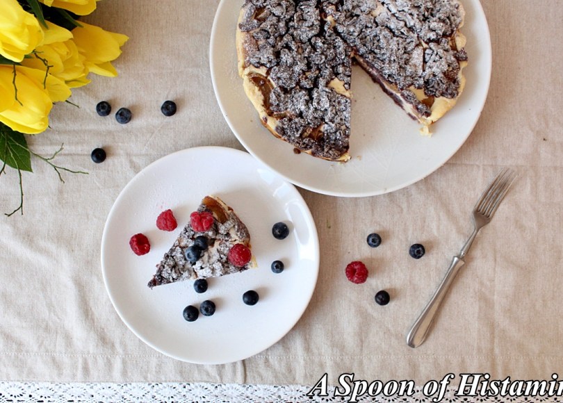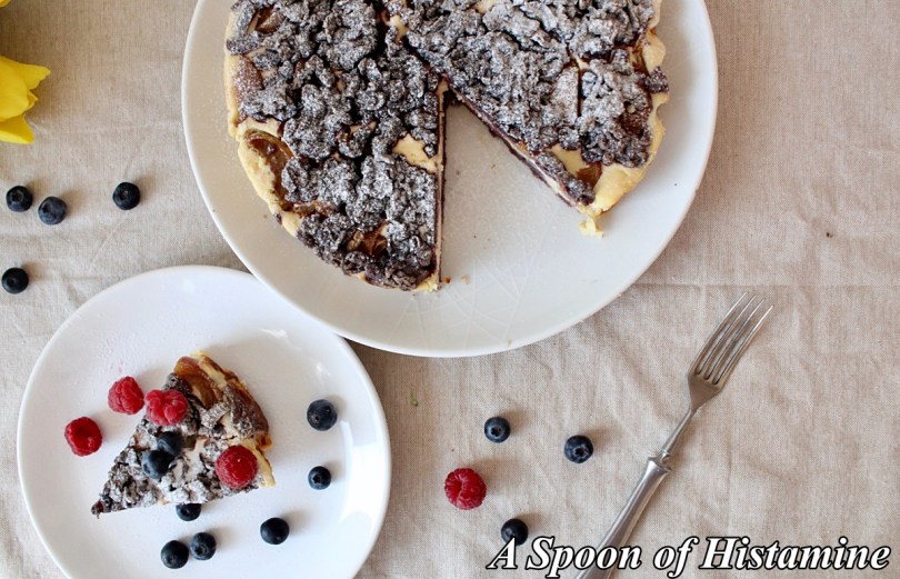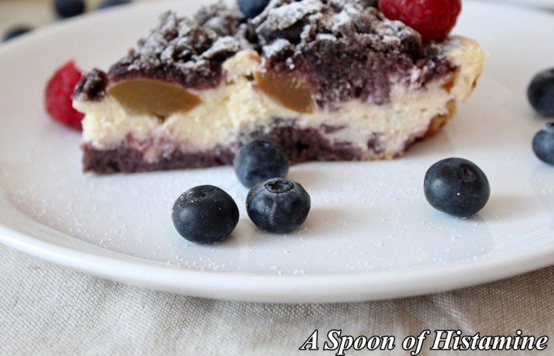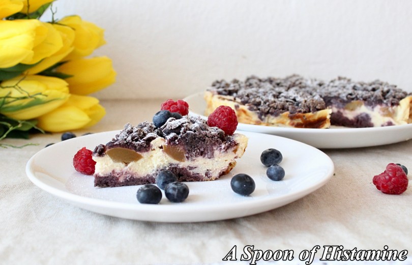Strouhaná vrstva těsta však není s kakaem, jak by se mohlo zdát. Je tam však mouka z černé rýže, která má právě díky obsahu přírodních látek zabarvujících rýži super účinky. Navíc vám tak trochu nahradí barvu kakaa a můžete tak obalamutit nejen děti, ale trochu i sebe. I když si nemyslím, že by histamin měl kvalitní kakao vyřazovat, pořád je spousta lidí na kakao alergická nebo citlivá na některé jeho součásti.