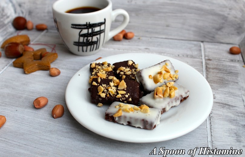 Troubu předehřejeme na 160°C. Těsto nechte povolit, zpracujte a jelikož se bude trochu drolit, přidejte 1-2 lžíce rozpuštěného kokosového oleje. Zpracujte a mezi dvěma pláty papíru na pečení, aby se těsto nelepilo, rozválejte na cca 3/4 cm silnou placku. Vykrajujte tyčinky, které pak pečte cca 10 minut, aby byl povrch tuhý. Mezitím si rukama nadrťte připravené arašídy a dejte do trouby péct k tyčinkám, při této nízké teplotě jim dejte tak 20-30 minut, aby se nespálily, ale byly křupavé. Tyčinky nechte vychladnout. Rozpusťte čokoládu či kakaové máslo, ve kterém pak rozmícháte nepražené kakao, a tyčinky z jedné strany namáčejte. Posypte nadrcenými arašídovými ořechy a uchovejte v chladu dobře uzavřené.