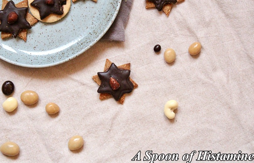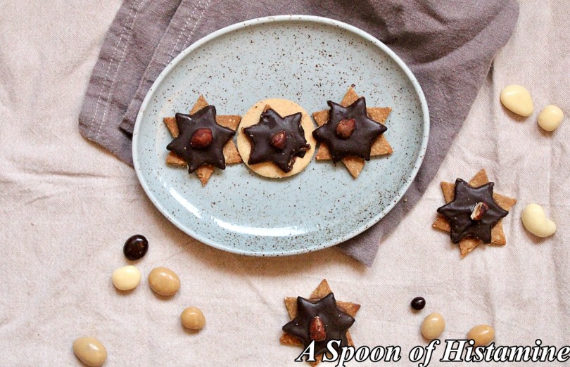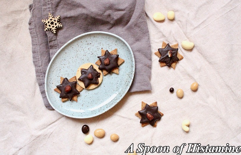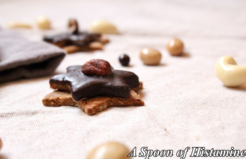V den pečení rozehřejeme troubu na 160 C. Těsto vyválíme mezi dvěma pláty pečícího papíru na cca 3 mm silnou placku a vykrajujeme hvězdičky. Já jsem zvolila dvě velikosti, aby na sobě byly po slepení vidět. Pečeme cca 8 – 10 minut, necháme na plechu vychladnout. Vrchní menší hvězdu můžeme polít tolerovanou čokoládovou polevou, ale není to vůbec nutné. Hvězdy spojujeme ideálně čistým lískooříškovým máslem, v případě intolerance či když nemáme, můžeme dát jiné, případně poslouží i domácí džem. Nahoru můžeme na čokoládu položit lískový ořech či bez použití čokolády jej také přilepit ořechévým máslem.