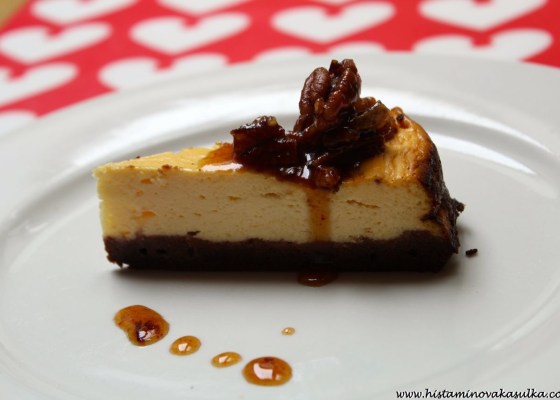 Tvarohový dort na brownie podkladu s karamelizovanými pekanovými ořechy