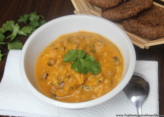 Máslová dýně s fazolí černé oko a kozím přelivem